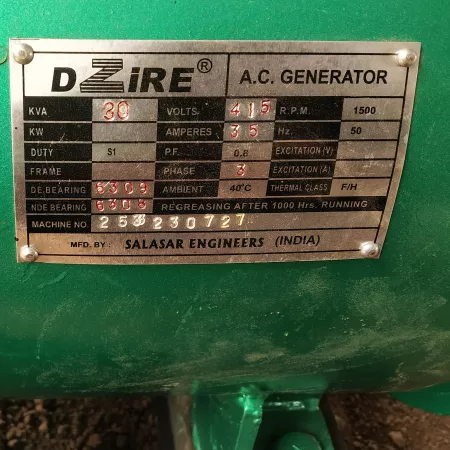 Make tata 30 kva, phess 3, volts 415, Hz 50, RPM 1500, pf 0.8, amps 35, water cooling system,